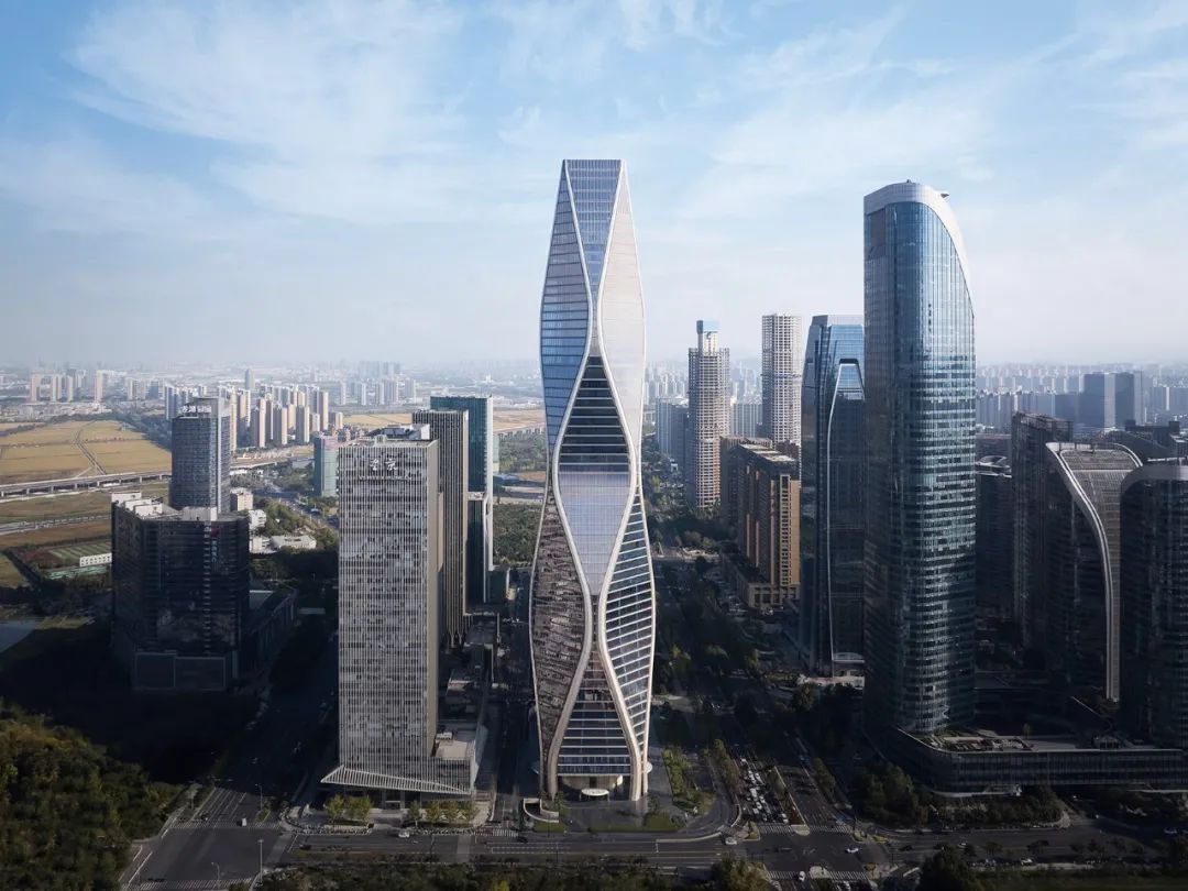 12.5 萬平方米的塔樓,造型獨(dú)特,沿著脈動(dòng)的曲線向著云端升騰,讓人聯(lián)想到錢塘江漣漪的波紋。
