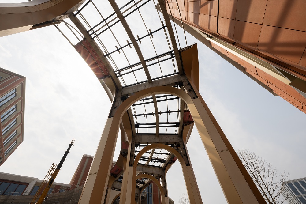 以組團(tuán)內(nèi)一座優(yōu)雅大氣的外部環(huán)廓為例:典雅高聳的金色立柱結(jié)合金屬光澤的大弧度金色鋁板,毫無罅隙的相互拼接,打造低奢又不失浪漫的小憩之所。無論是在陽光的照耀下的金色光澤,還是在月色的映襯中清幽弧線,幕墻裝飾的穹頂都能展現(xiàn)出獨(dú)特的質(zhì)感和光澤,為整個(gè)研發(fā)中心增添了一份神秘而迷人的魅力。