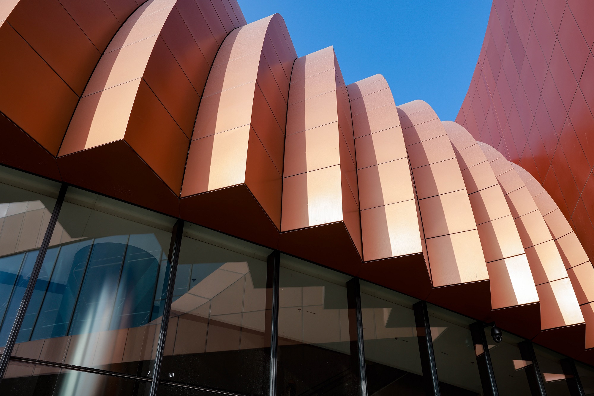 北京新國展“紫金絲帶”褶皺板,每件板上下、左右角度都有區(qū)別變化,左右呈發(fā)散式布局安裝,上下角度變化2.5度。尺寸偏差不超±1毫米,角度偏差不超過±0.5度,每件板都需專用模標(biāo)尺測量弧度。
