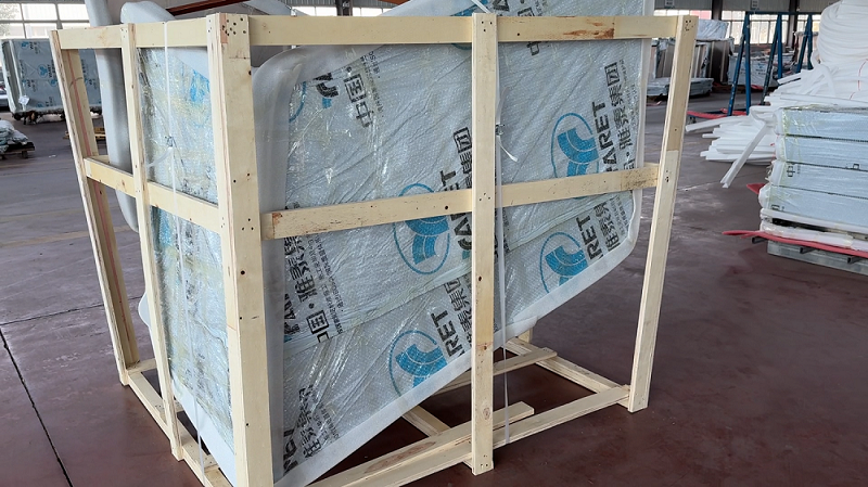 成品褶皺板經(jīng)檢驗(yàn)合格后,分別用保護(hù)膜,外附加一層氣泡膜進(jìn)行包裝防護(hù)。裝運(yùn)時(shí)釘制專用木箱進(jìn)行外圍運(yùn)輸防護(hù)。